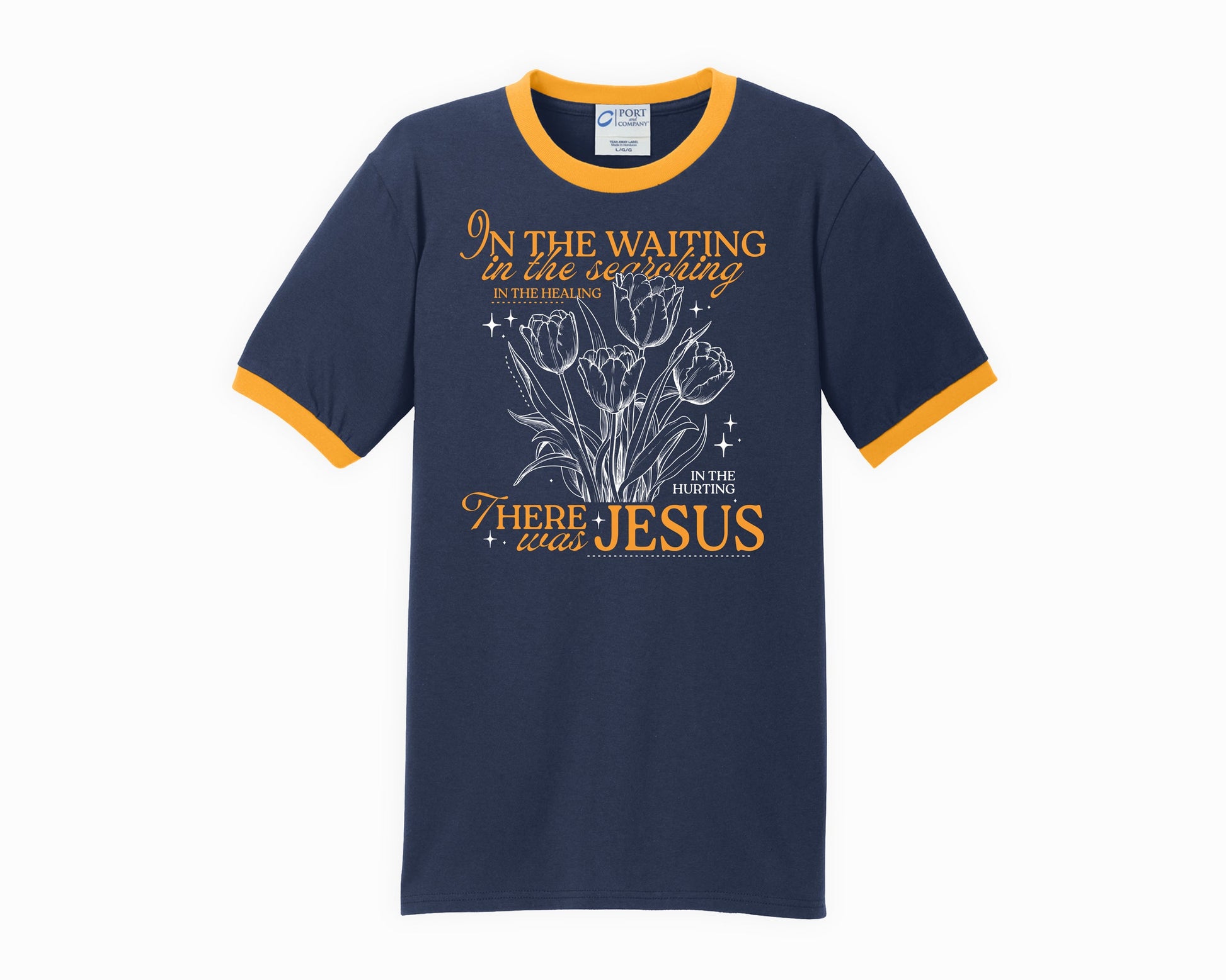 - DTF printed design featuring "In the Waiting, In the Searching, In the Healing, In the Hurting, There was Jesus" with delicate hand-drawn tulip bouquet