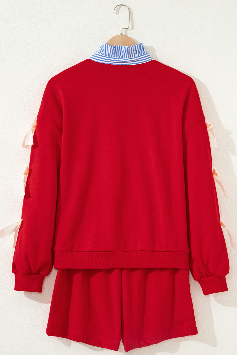 This casual two-piece set combines comfort and style effortlessly. Featuring a baggy pullover sweatshirt with a contrast striped collar and charming satin bow accents, paired with matching drawstring shorts. Crafted from a quality cotton-blend fabric with medium stretch, it offers a soft, comfortable fit perfect for relaxed days or casual outings.