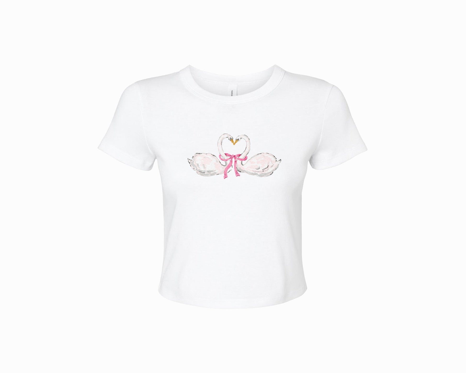 Float through your day in this delicate crop top adorned with graceful swan illustrations. The sweet, vintage-inspired design features two elegant swans connected by a dainty pink bow, creating a dreamy, storybook aesthetic that's equal parts whimsical and sophisticated. Who said Love is for the birds anyway?